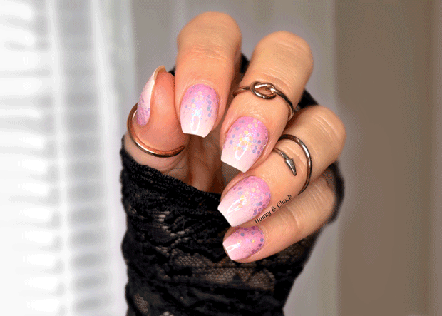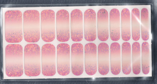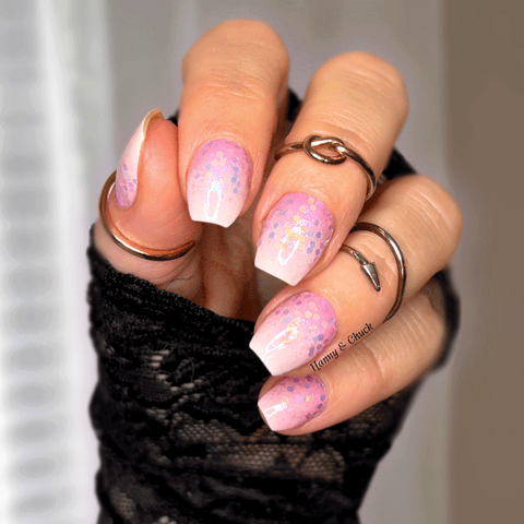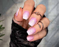 This soft strawberry-pink gradient fades into a dreamy milky base, sprinkled with iridescent confetti glitter at the cuticle that catches the light like sugar crystals. It’s sweet, sparkly, and playful.