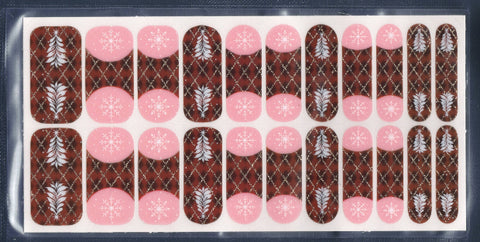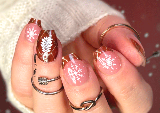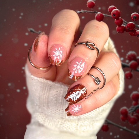 A soft, sheer French tip that blends cozy winter patterns with a hint of festive charm. The tips feature a warm, quilt-inspired mahogany plaid trimmed with fine gold accents, while the base showcases delicate pink snowflakes and white winter foliage. Light, airy, and perfectly seasonal — a warm-and-frosty contrast that feels both wintry and sweet without being over the top.
