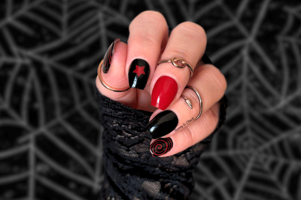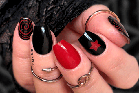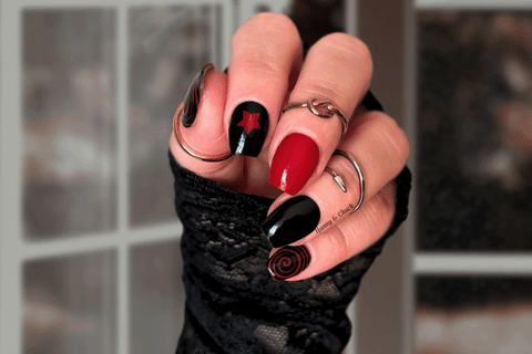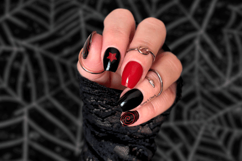 Edgy, mysterious, and bold—this set is all about high contrast and dramatic detail. The deep black base meets a striking crimson red, accented with hypnotic swirls and a single star motif that feels straight out of a midnight dream. Perfect for anyone who loves a manicure that’s both darkly playful and statement-making.