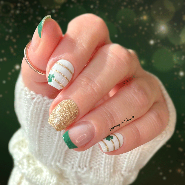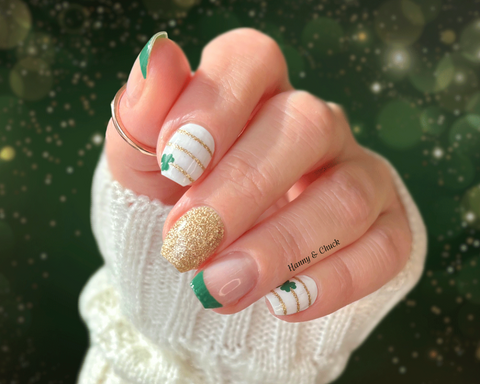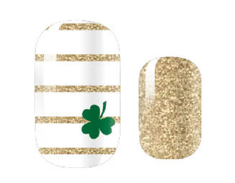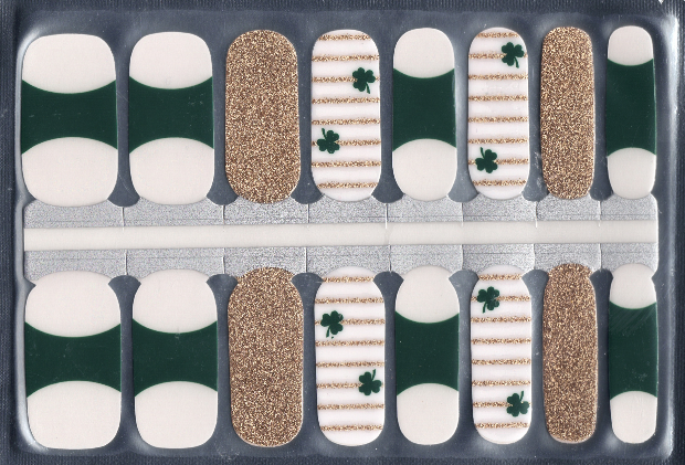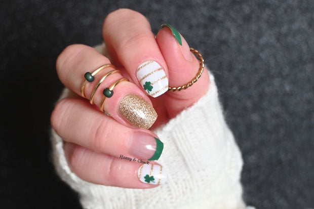 Celebrate St. Patrick's Day with these festive nail polish wraps! This festive design features classic green French tips, sparkling gold stripes, and lucky clovers.