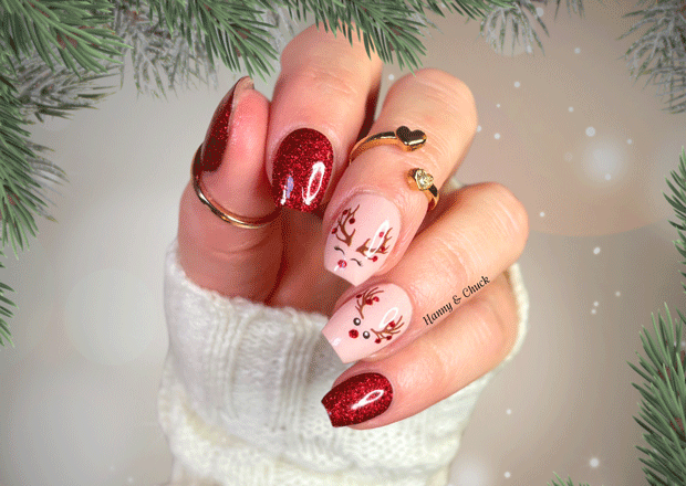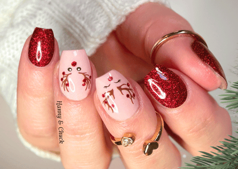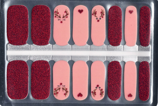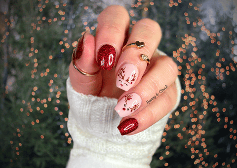 A rosy-blush base paired with deep ruby glitter brings the sweetest holiday magic. Tiny reindeer faces peek through with berry-tipped antlers and fluttery lashes, mixed with little glitter hearts and rich red sparkle accents. It feels like rosy cheeks after playing in the snow, cocoa by the tree, and classic Rudolph movie nights — cozy, nostalgic, and full of festive charm.
