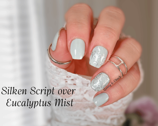 Silken Script features a graceful pattern of silver, calligraphy-style swirls and flourishes over a completely clear base — letting whatever colour you’re wearing underneath shine through. It’s designed as an overlay, so you can layer it over any nail polish or wrap to add a soft, elegant shimmer with a vintage scroll vibe. ✨