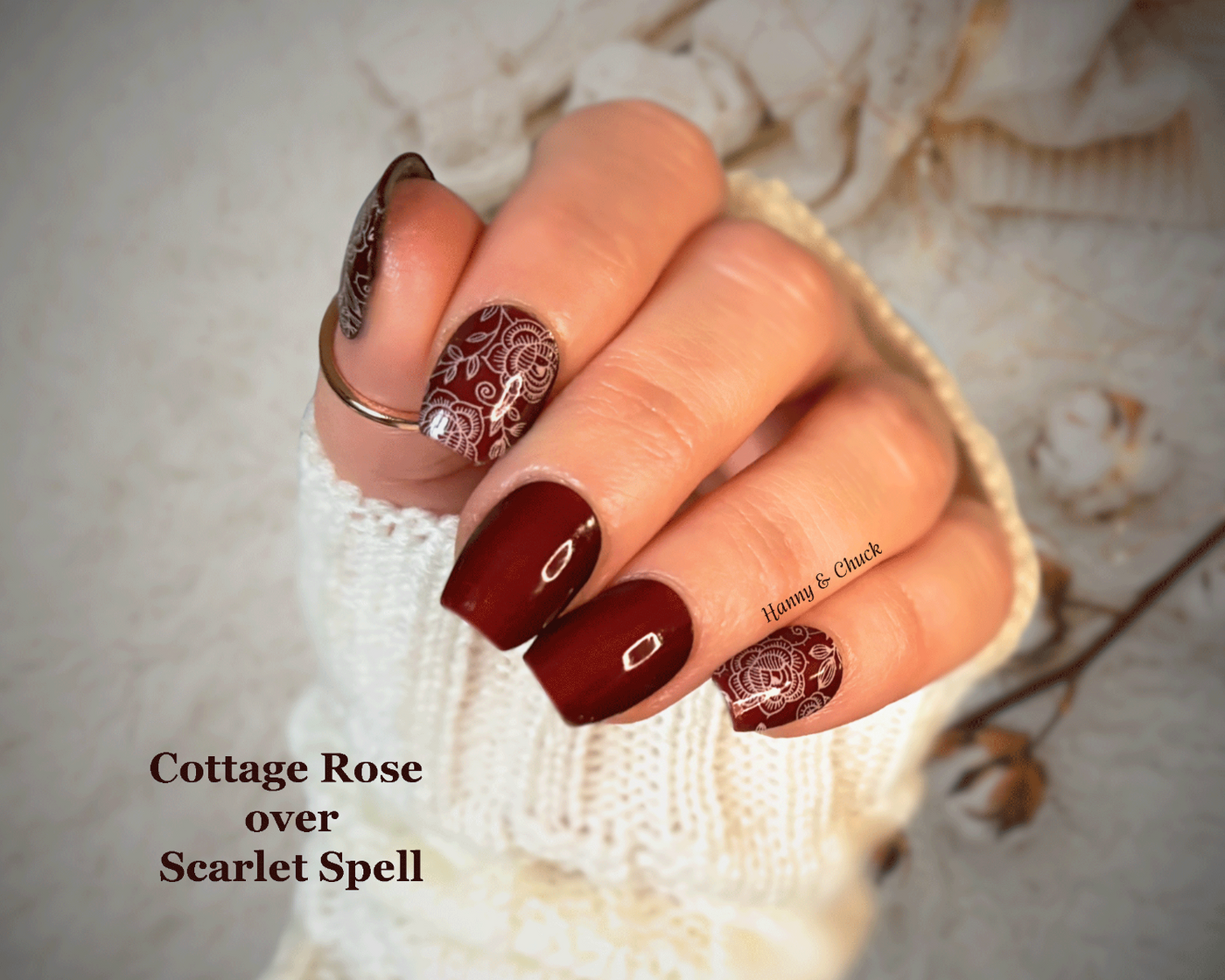 Cottage Rose is a rose-gold floral overlay designed to add soft, detailed botanical art to your manicure. Wear it on its own over natural nails or layer it over your favourite coloured wraps for a delicate, hand-drawn look.