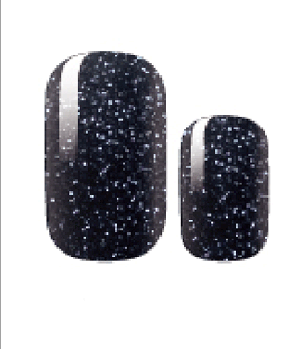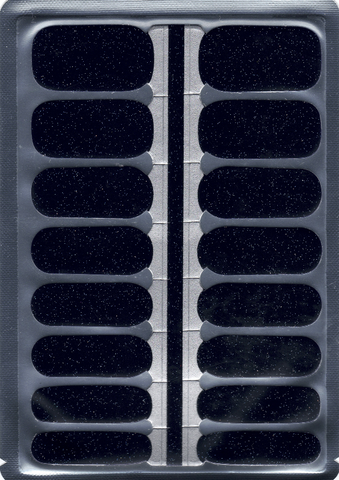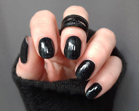 A Touch of Magic is a glossy black nail wrap finished with delicate, scattered holographic sparkle. The base is rich and inky, while the fine glitter catches light subtly, adding depth without turning the look flashy or over-the-top.