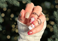 Get your nails holiday-ready with our Santa’s Giftwrap nail wraps! This merry mix of red, white, and gold brings all the Christmas cheer right to your fingertips. Each set features a delightful combination of designs — a sparkling gold accent nail, a festive red gift bow, a cheerful Santa face, and classic snowflake details.
