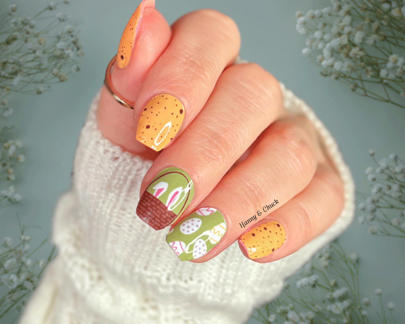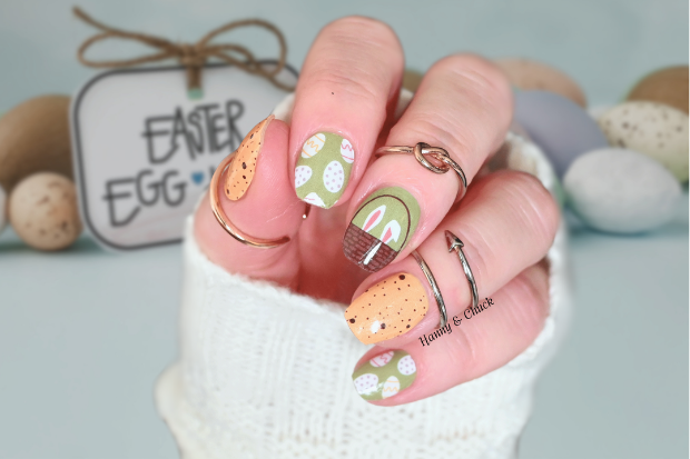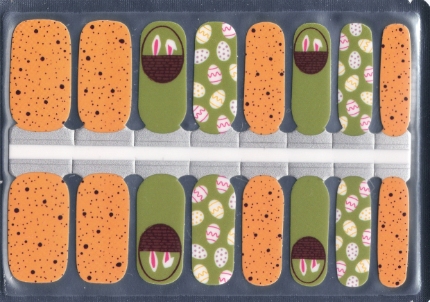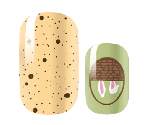 These Spring Surprise nail polish wraps blend festive Easter elements with earthy tones. The Speckled Orange wraps resemble candy eggs, adding a playful touch, while the Easter Egg Print features pastel eggs on a muted green base for a soft holiday vibe. The Bunny in a Basket accent wraps complete the look with a charming peek of bunny ears, making this set perfect for spring celebrations.
