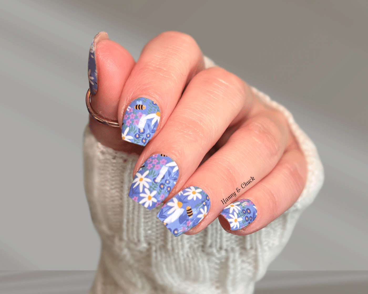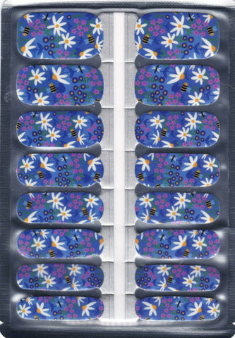 The soft blue background is scattered with delicate white daisies and little honeybees, creating a look that feels fresh, playful, and full of sunshine.