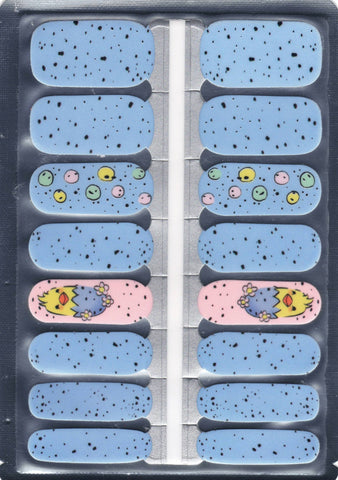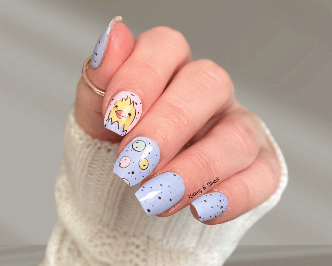 Spring Peep is a soft, playful spring nail wrap set featuring pale blue speckled nails, egg-inspired accent designs, and illustrated chick details. The mix of patterns feels cheerful without being overwhelming, making it easy to wear while still adding a bit of personality.