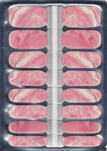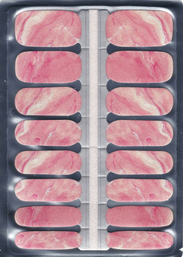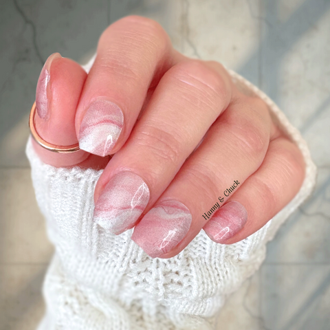 Saltwater Silk is a soft, sheer pink nail wrap with gentle ivory marbling and a delicate pearlescent finish. The surface catches light quietly, creating a feel that's natural and understated rather than sparkly or bold.