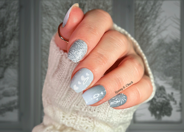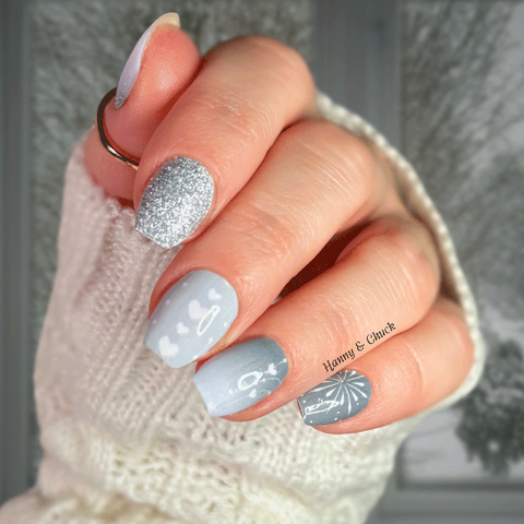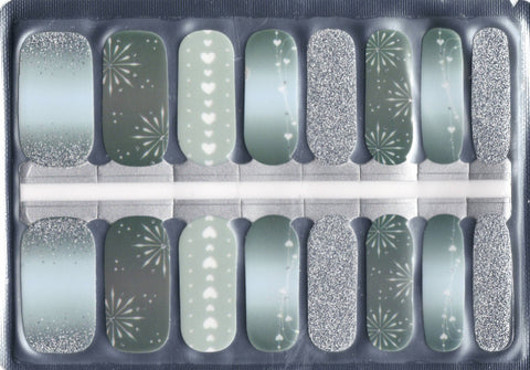 A soft, wintry dream in shades of sage, grey, and silver. Winter Trinket blends frosted gradients, tiny heart trails, and delicate snowflake sparkles for a look that feels like a keepsake from a snowy holiday season. Silver glitter accents add a touch of festive shimmer, while the muted green-grey base keeps everything calm, cozy, and beautifully understated.